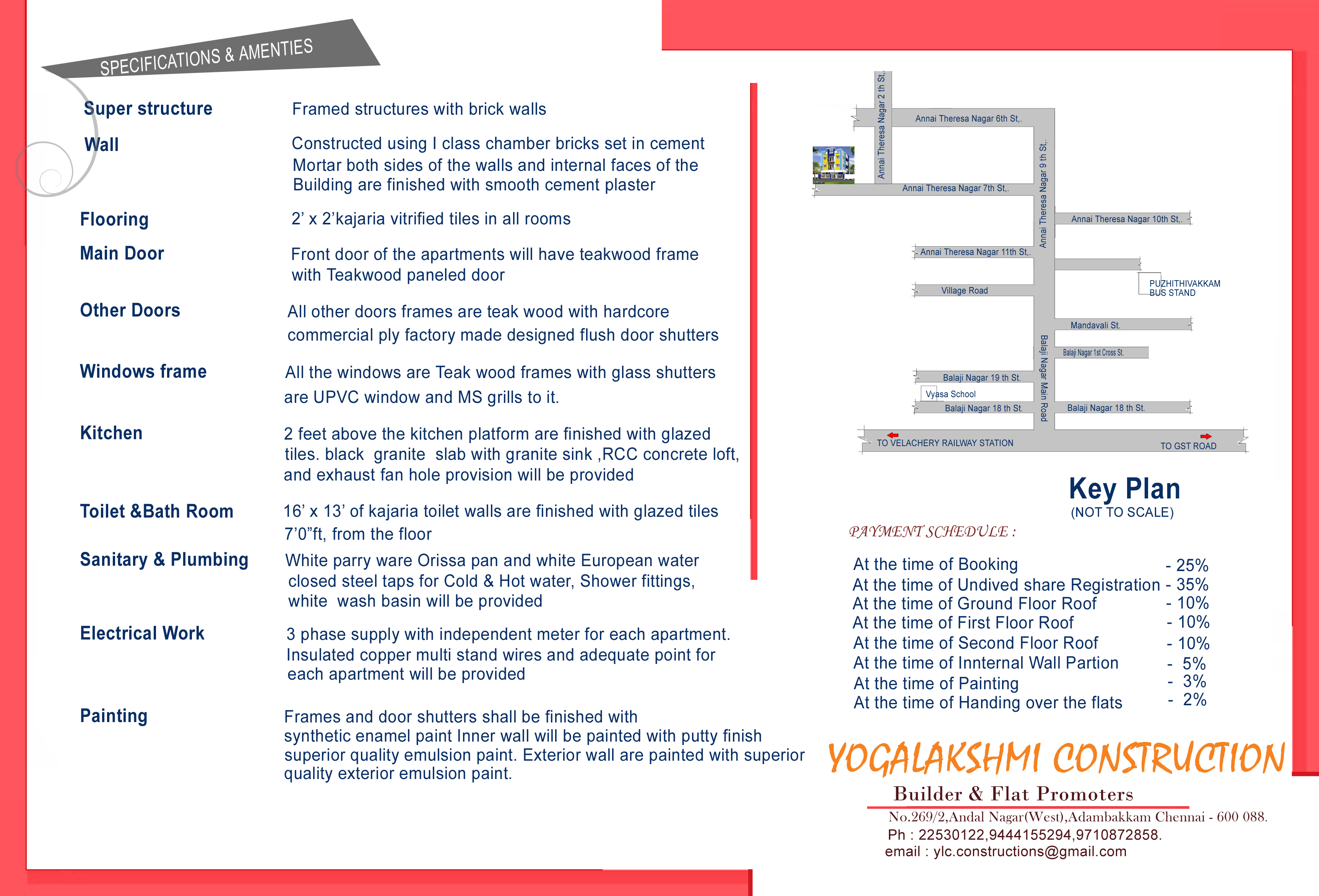 We are doing projects in puzhuthivakkam. To understand and fulfill customer's needs by delivering the most practical, high-quality building solutions at an affordable price and ensure they gain in every manner. Yogalakshmi construction valuable customer knows this very well. Our equality perception is above everything from basement to finishing we adhere to best standards.