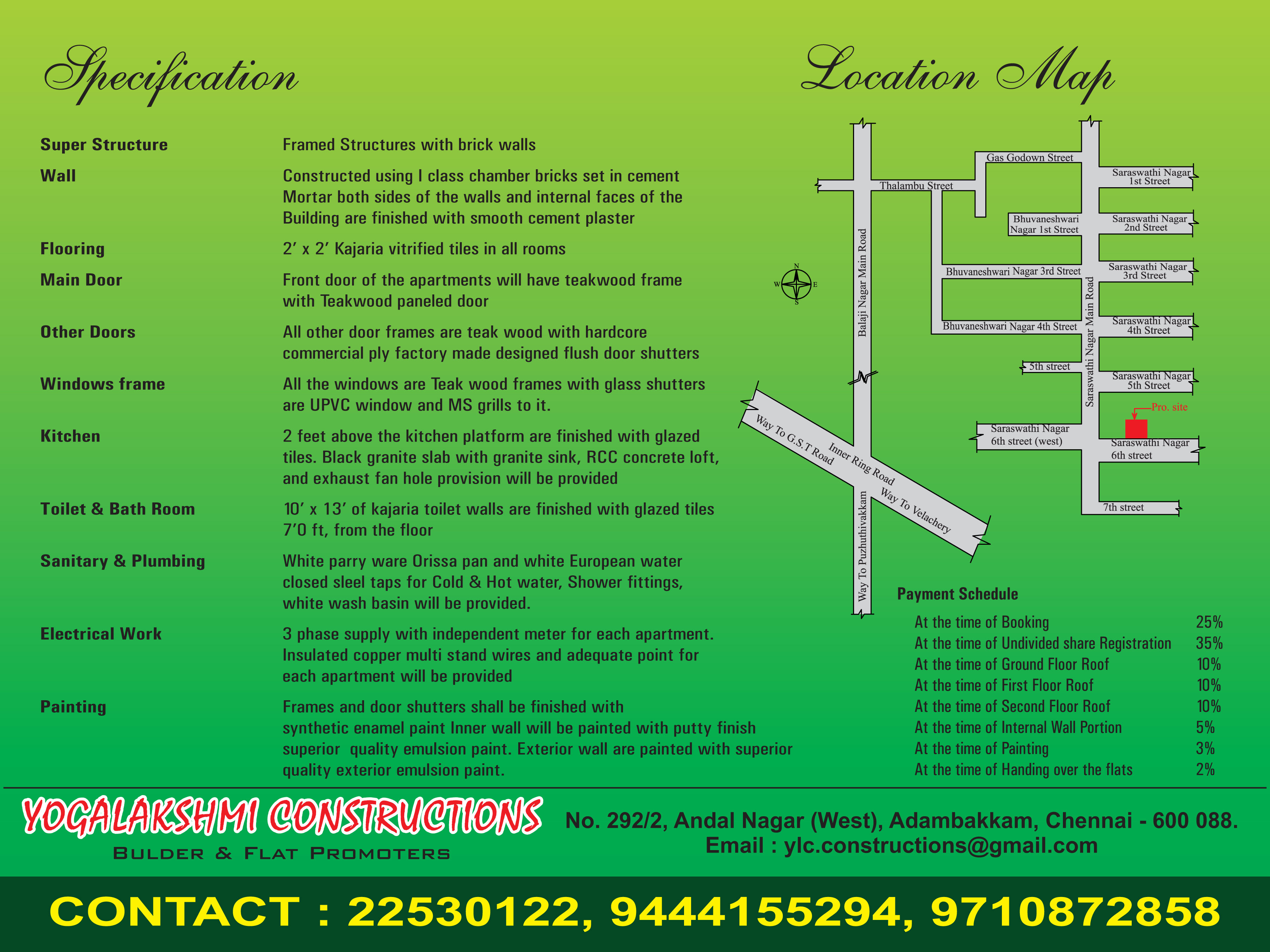 We are doing projects in puzhuthivakkam. To understand and fulfill customer's needs by delivering the most practical, high-quality building solutions at an affordable price and ensure they gain in every manner. Yogalakshmi construction valuable customer knows this very well. Our equality perception is above everything from basement to finishing we adhere to best standards.